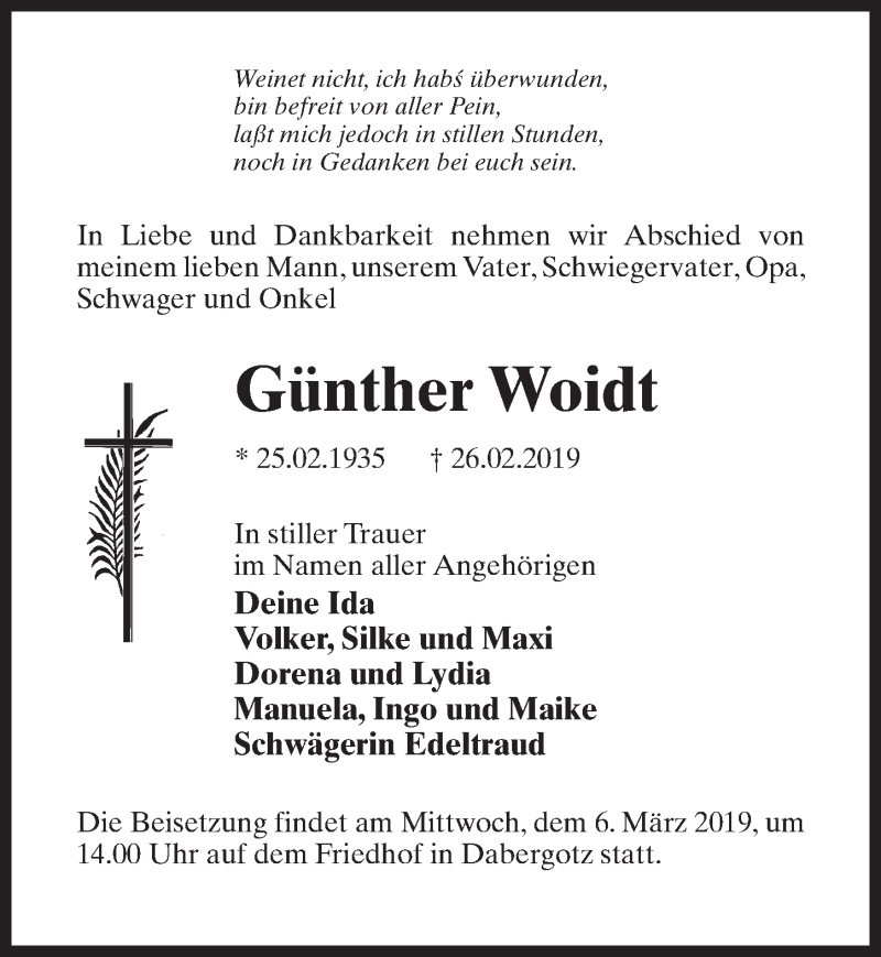 Hier finden Sie alle Traueranzeigen aus der Zeitung, die bisher für Günther Woidt erschienen sind. Weitere Traueranzeigen, die in der Zeitung erscheinen, werden hier ebenfalls aufgelistet
