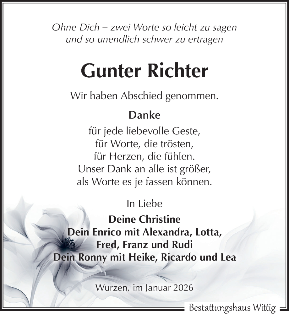 Hier finden Sie alle Traueranzeigen aus der Zeitung, die bisher für Gunter Richter erschienen sind. Weitere Traueranzeigen, die in der Zeitung erscheinen, werden hier ebenfalls aufgelistet