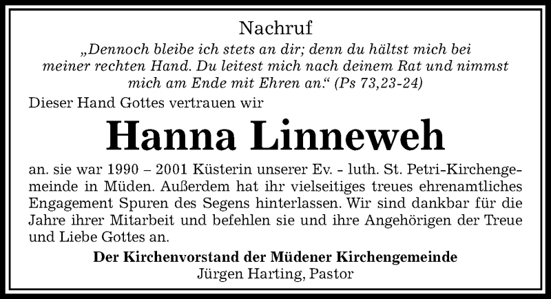 Hier finden Sie alle Traueranzeigen aus der Zeitung, die bisher für Hanna Linneweh erschienen sind. Weitere Traueranzeigen, die in der Zeitung erscheinen, werden hier ebenfalls aufgelistet