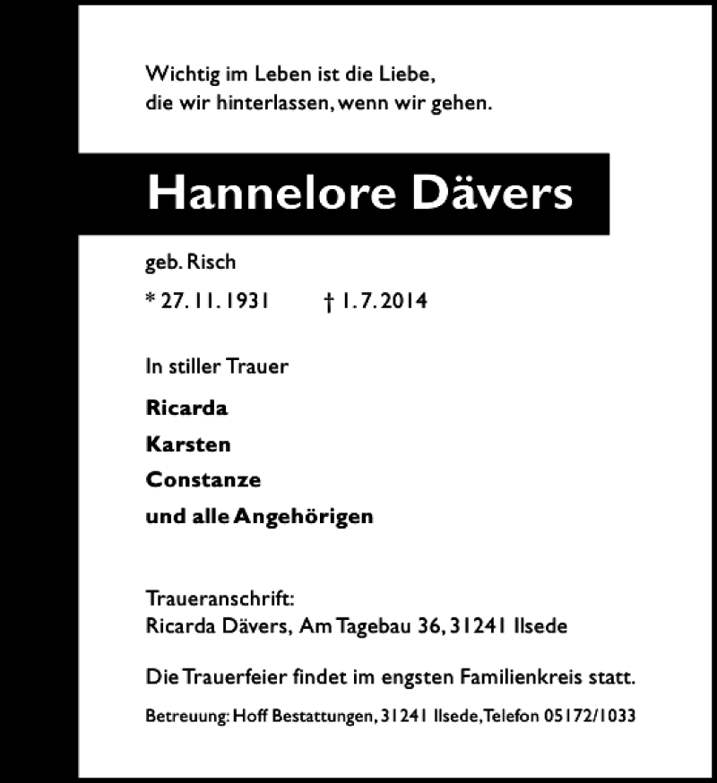 Hier finden Sie alle Traueranzeigen aus der Zeitung, die bisher für Hannelore Dävers erschienen sind. Weitere Traueranzeigen, die in der Zeitung erscheinen, werden hier ebenfalls aufgelistet