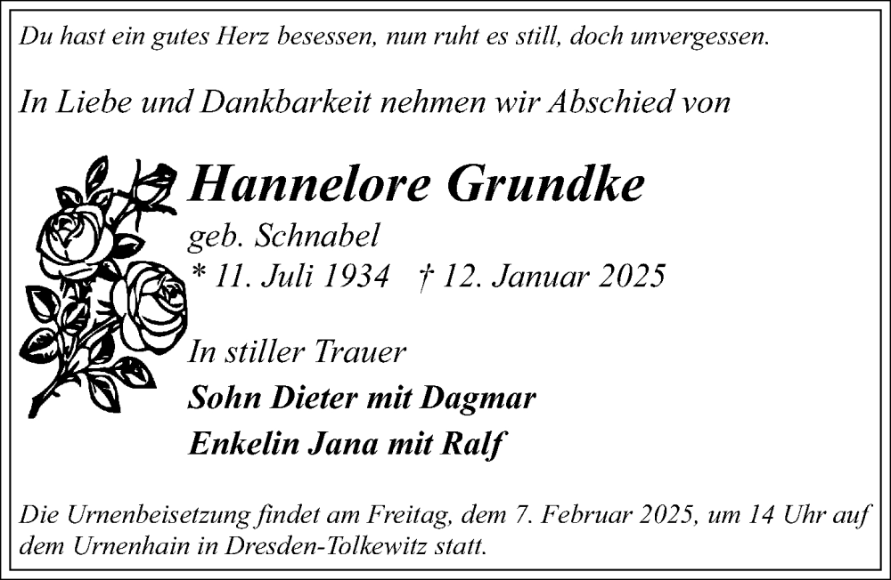 Hier finden Sie alle Traueranzeigen aus der Zeitung, die bisher für Hannelore Grundke erschienen sind. Weitere Traueranzeigen, die in der Zeitung erscheinen, werden hier ebenfalls aufgelistet