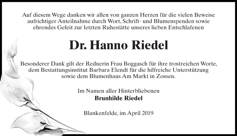 Hier finden Sie alle Traueranzeigen aus der Zeitung, die bisher für Hanno Riedel erschienen sind. Weitere Traueranzeigen, die in der Zeitung erscheinen, werden hier ebenfalls aufgelistet