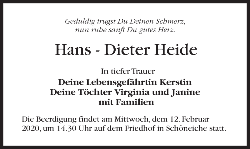 Hier finden Sie alle Traueranzeigen aus der Zeitung, die bisher für Hans-Dieter Heide erschienen sind. Weitere Traueranzeigen, die in der Zeitung erscheinen, werden hier ebenfalls aufgelistet