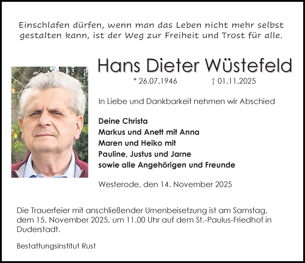 Hier finden Sie alle Traueranzeigen aus der Zeitung, die bisher für Hans Dieter Wüstefeld erschienen sind. Weitere Traueranzeigen, die in der Zeitung erscheinen, werden hier ebenfalls aufgelistet