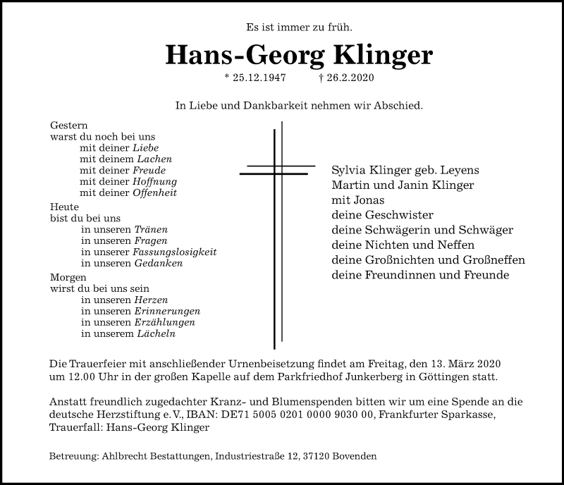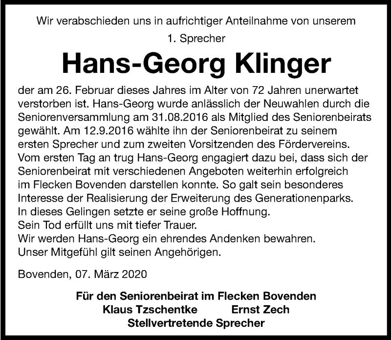Hier finden Sie alle Traueranzeigen aus der Zeitung, die bisher für Hans-Georg Klinger erschienen sind. Weitere Traueranzeigen, die in der Zeitung erscheinen, werden hier ebenfalls aufgelistet