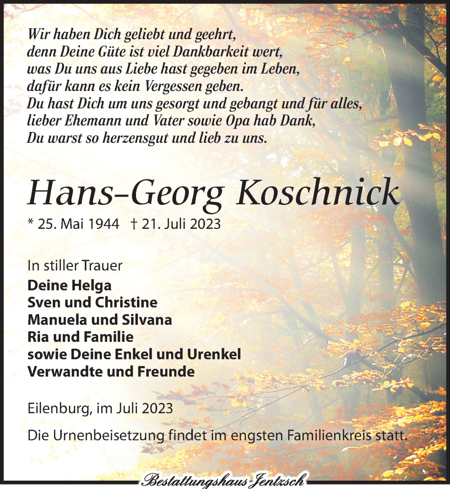 Hier finden Sie alle Traueranzeigen aus der Zeitung, die bisher für Hans-Georg Koschnick erschienen sind. Weitere Traueranzeigen, die in der Zeitung erscheinen, werden hier ebenfalls aufgelistet