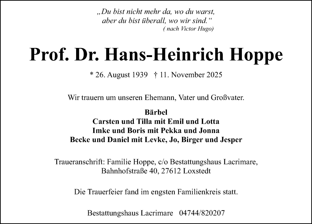 Hier finden Sie alle Traueranzeigen aus der Zeitung, die bisher für Hans-Heinrich Hoppe erschienen sind. Weitere Traueranzeigen, die in der Zeitung erscheinen, werden hier ebenfalls aufgelistet