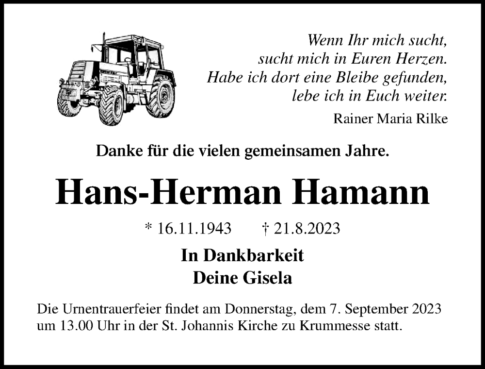 Hier finden Sie alle Traueranzeigen aus der Zeitung, die bisher für Hans-Herman Hamann erschienen sind. Weitere Traueranzeigen, die in der Zeitung erscheinen, werden hier ebenfalls aufgelistet