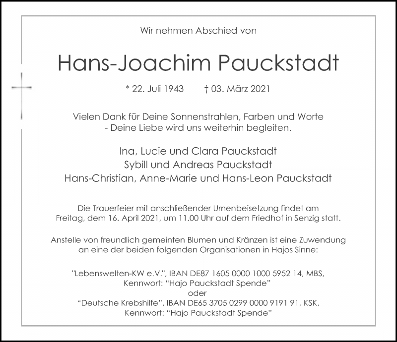 Hier finden Sie alle Traueranzeigen aus der Zeitung, die bisher für Hans-Joachim Pauckstadt erschienen sind. Weitere Traueranzeigen, die in der Zeitung erscheinen, werden hier ebenfalls aufgelistet