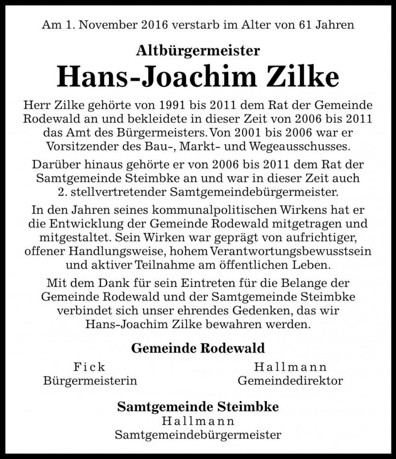 Hier finden Sie alle Traueranzeigen aus der Zeitung, die bisher für Hans-Joachim Zilke erschienen sind. Weitere Traueranzeigen, die in der Zeitung erscheinen, werden hier ebenfalls aufgelistet