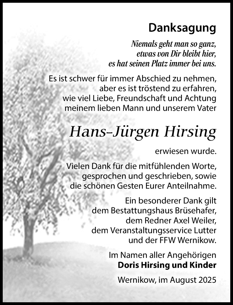 Hier finden Sie alle Traueranzeigen aus der Zeitung, die bisher für Hans-Jürgen Hirsing erschienen sind. Weitere Traueranzeigen, die in der Zeitung erscheinen, werden hier ebenfalls aufgelistet