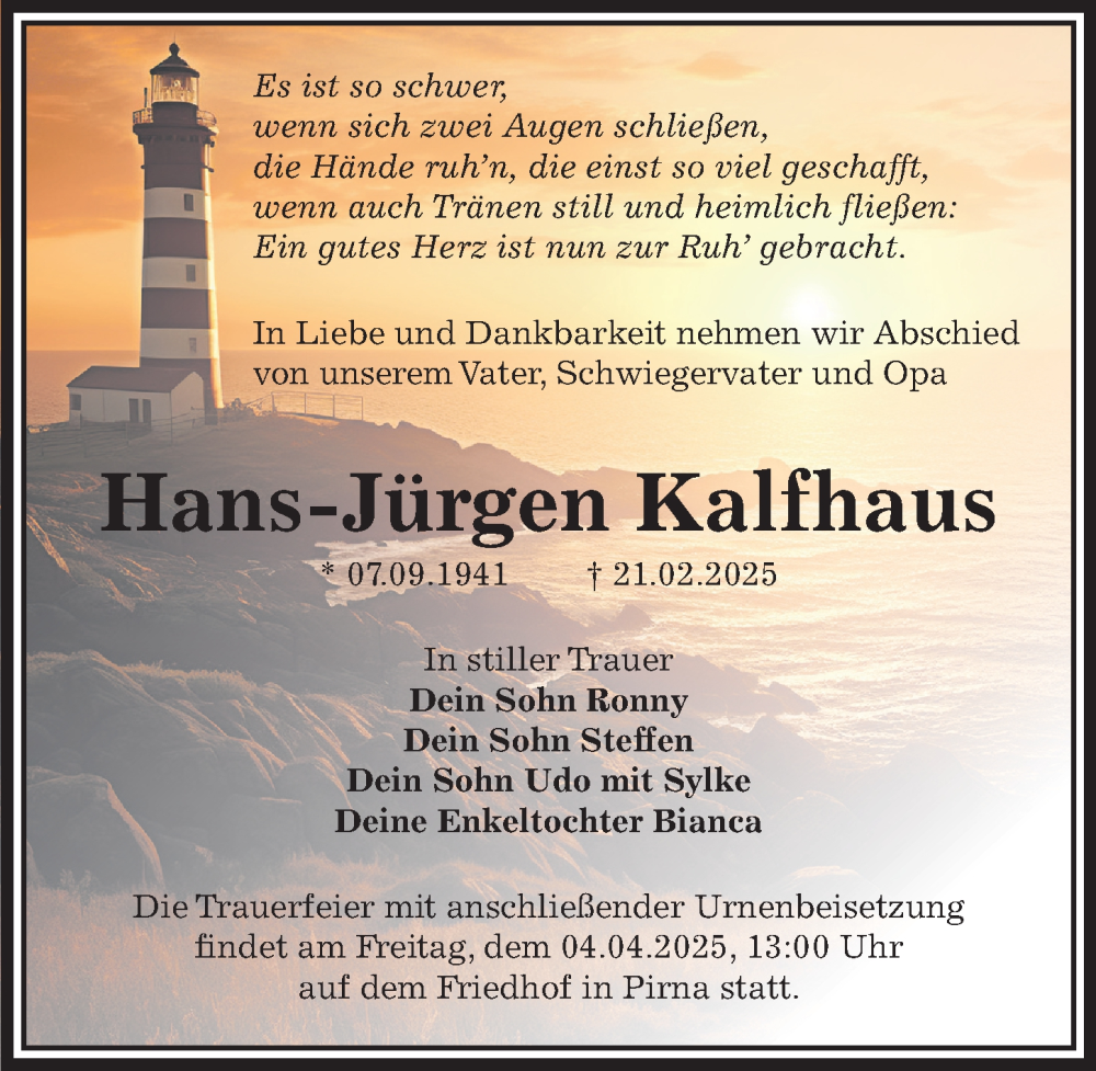 Hier finden Sie alle Traueranzeigen aus der Zeitung, die bisher für Hans-Jürgen Kalfhaus erschienen sind. Weitere Traueranzeigen, die in der Zeitung erscheinen, werden hier ebenfalls aufgelistet