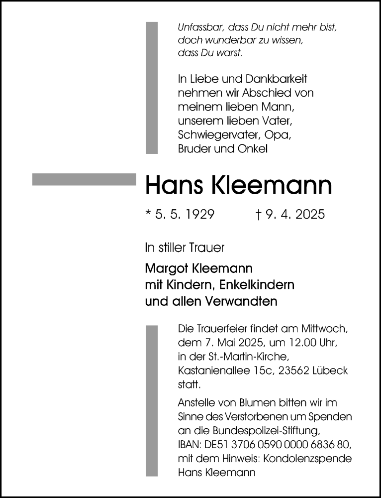Hier finden Sie alle Traueranzeigen aus der Zeitung, die bisher für Hans Kleemann erschienen sind. Weitere Traueranzeigen, die in der Zeitung erscheinen, werden hier ebenfalls aufgelistet