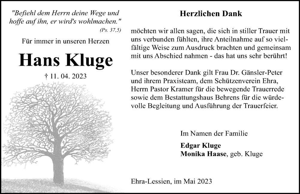Hier finden Sie alle Traueranzeigen aus der Zeitung, die bisher für Hans Kluge erschienen sind. Weitere Traueranzeigen, die in der Zeitung erscheinen, werden hier ebenfalls aufgelistet