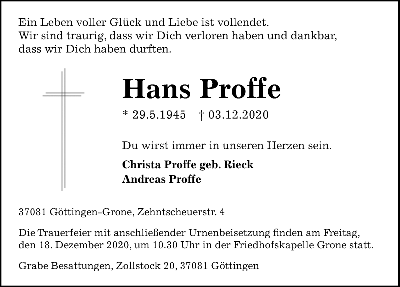 Hier finden Sie alle Traueranzeigen aus der Zeitung, die bisher für Hans Proffe erschienen sind. Weitere Traueranzeigen, die in der Zeitung erscheinen, werden hier ebenfalls aufgelistet