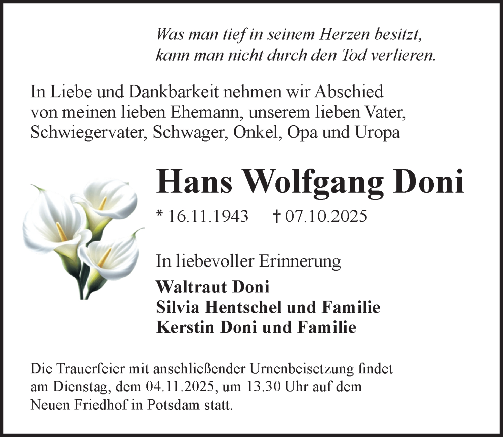 Hier finden Sie alle Traueranzeigen aus der Zeitung, die bisher für Hans Wolfgang Doni erschienen sind. Weitere Traueranzeigen, die in der Zeitung erscheinen, werden hier ebenfalls aufgelistet