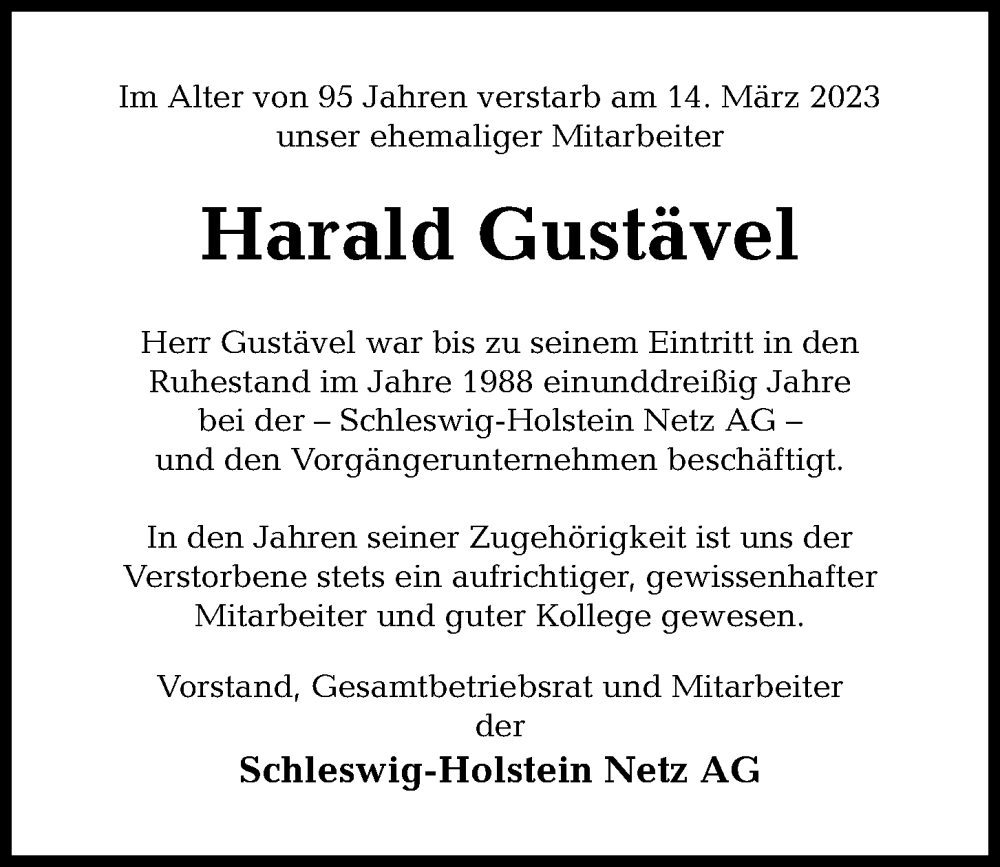 Hier finden Sie alle Traueranzeigen aus der Zeitung, die bisher für Harald Gustävel erschienen sind. Weitere Traueranzeigen, die in der Zeitung erscheinen, werden hier ebenfalls aufgelistet