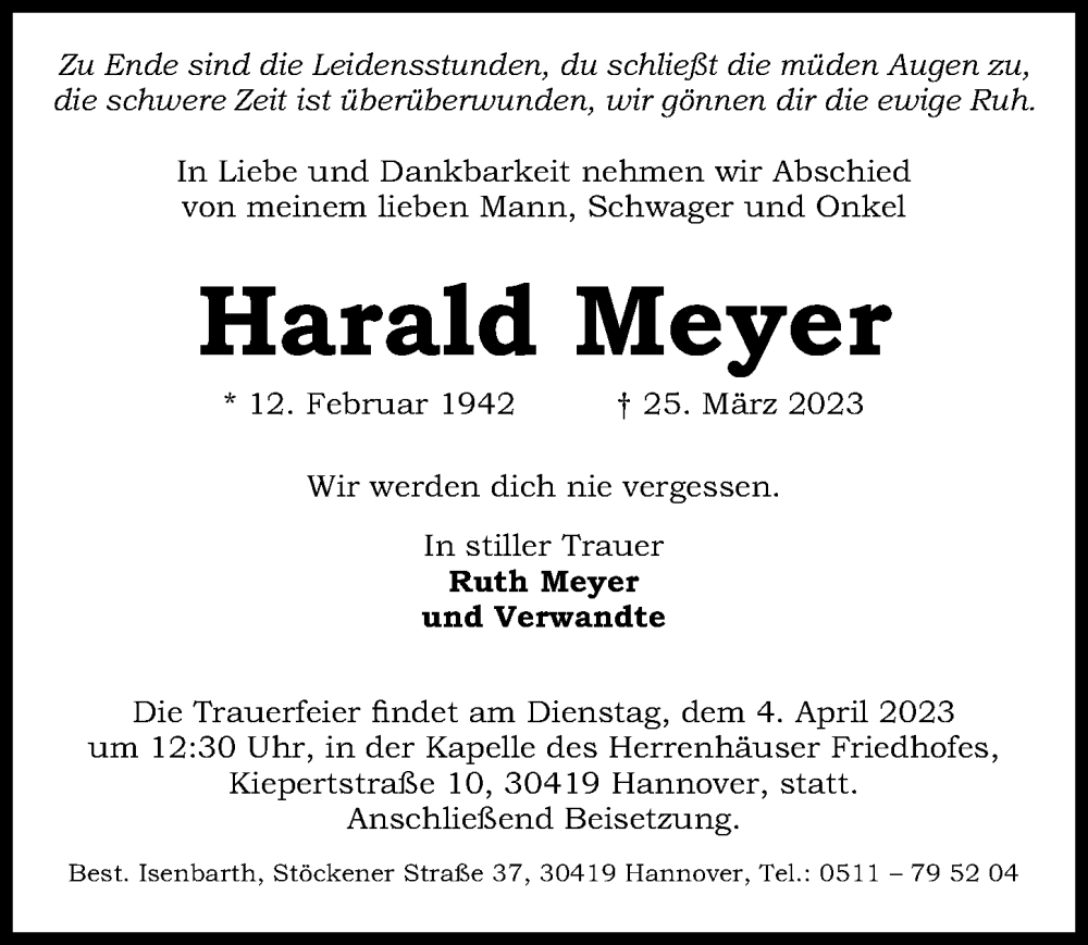 Hier finden Sie alle Traueranzeigen aus der Zeitung, die bisher für Harald Meyer erschienen sind. Weitere Traueranzeigen, die in der Zeitung erscheinen, werden hier ebenfalls aufgelistet