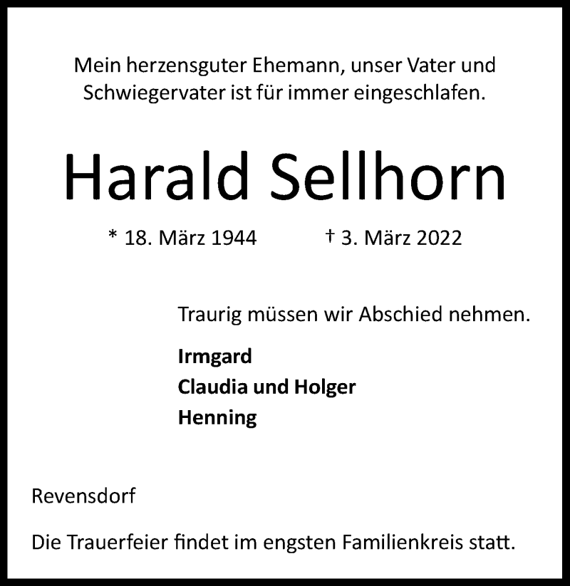 Hier finden Sie alle Traueranzeigen aus der Zeitung, die bisher für Harald Sellhorn erschienen sind. Weitere Traueranzeigen, die in der Zeitung erscheinen, werden hier ebenfalls aufgelistet