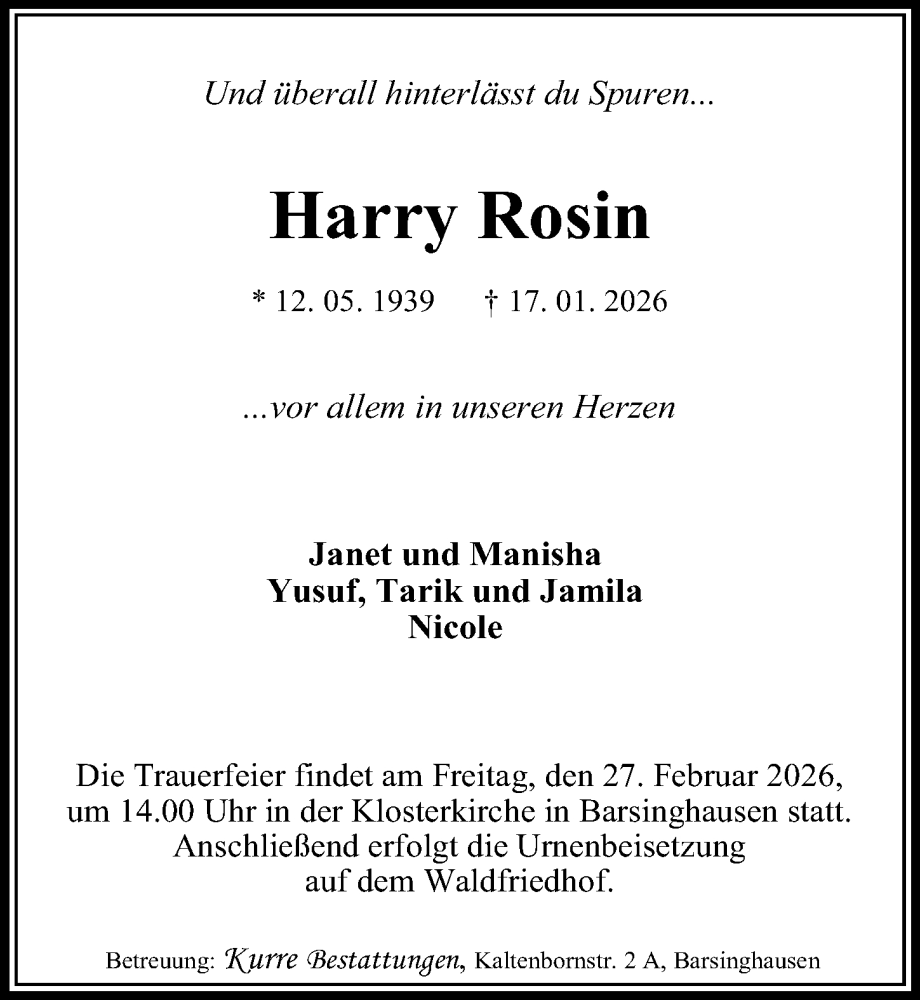 Hier finden Sie alle Traueranzeigen aus der Zeitung, die bisher für Harry Rosin erschienen sind. Weitere Traueranzeigen, die in der Zeitung erscheinen, werden hier ebenfalls aufgelistet