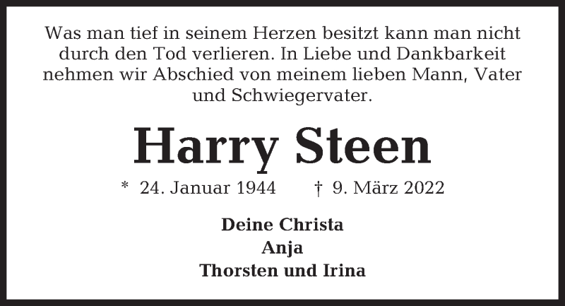 Hier finden Sie alle Traueranzeigen aus der Zeitung, die bisher für Harry Steen erschienen sind. Weitere Traueranzeigen, die in der Zeitung erscheinen, werden hier ebenfalls aufgelistet
