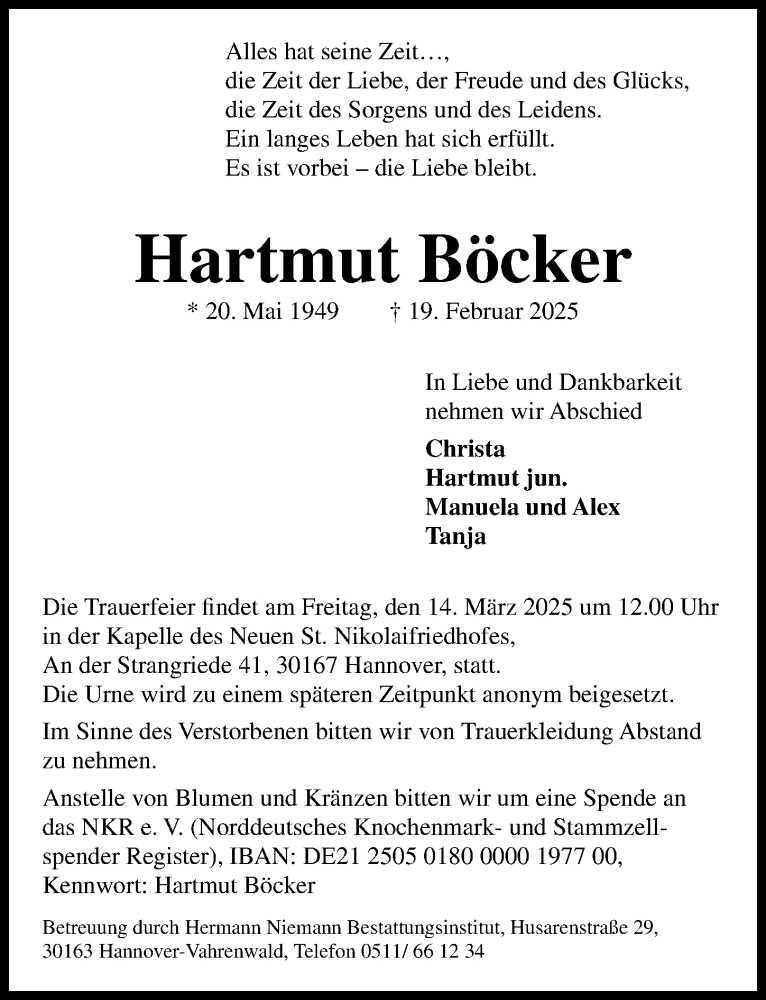 Hier finden Sie alle Traueranzeigen aus der Zeitung, die bisher für Hartmut Böcker erschienen sind. Weitere Traueranzeigen, die in der Zeitung erscheinen, werden hier ebenfalls aufgelistet