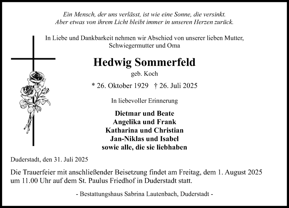 Hier finden Sie alle Traueranzeigen aus der Zeitung, die bisher für Hedwig Sommerfeld erschienen sind. Weitere Traueranzeigen, die in der Zeitung erscheinen, werden hier ebenfalls aufgelistet