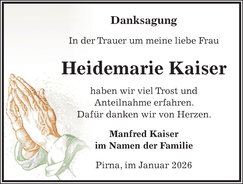 Hier finden Sie alle Traueranzeigen aus der Zeitung, die bisher für Heidemarie Kaiser erschienen sind. Weitere Traueranzeigen, die in der Zeitung erscheinen, werden hier ebenfalls aufgelistet