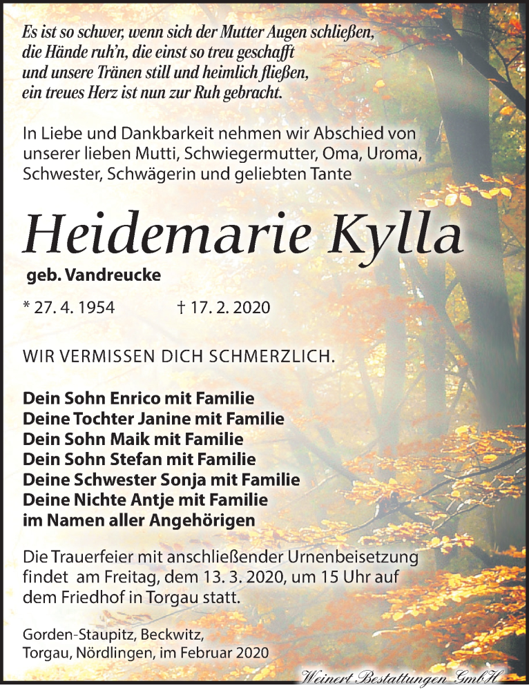 Hier finden Sie alle Traueranzeigen aus der Zeitung, die bisher für Heidemarie Kylla erschienen sind. Weitere Traueranzeigen, die in der Zeitung erscheinen, werden hier ebenfalls aufgelistet