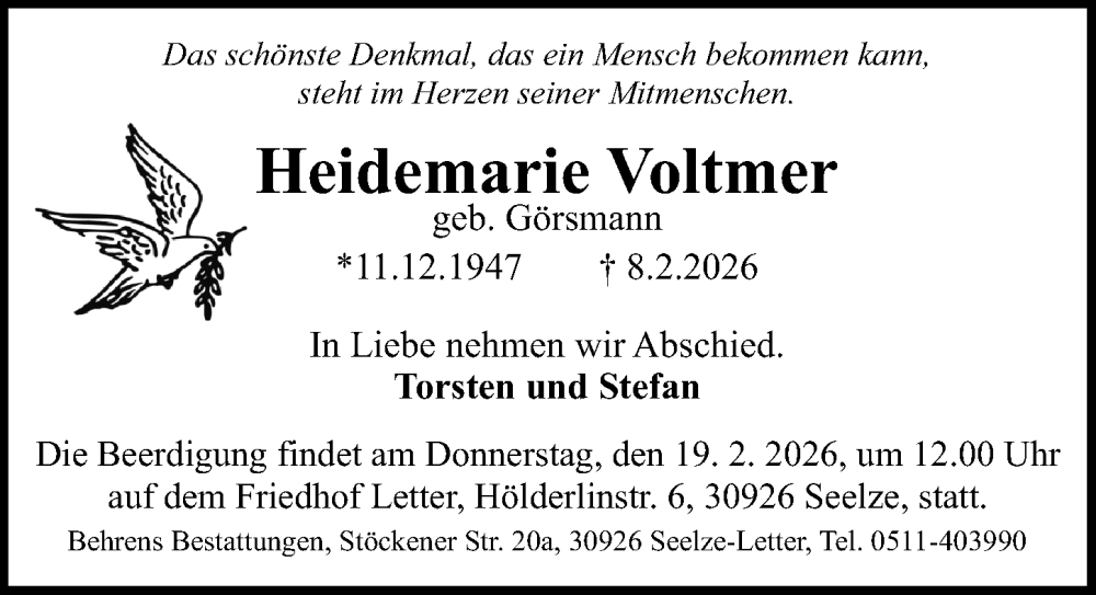 Hier finden Sie alle Traueranzeigen aus der Zeitung, die bisher für Heidemarie Voltmer erschienen sind. Weitere Traueranzeigen, die in der Zeitung erscheinen, werden hier ebenfalls aufgelistet