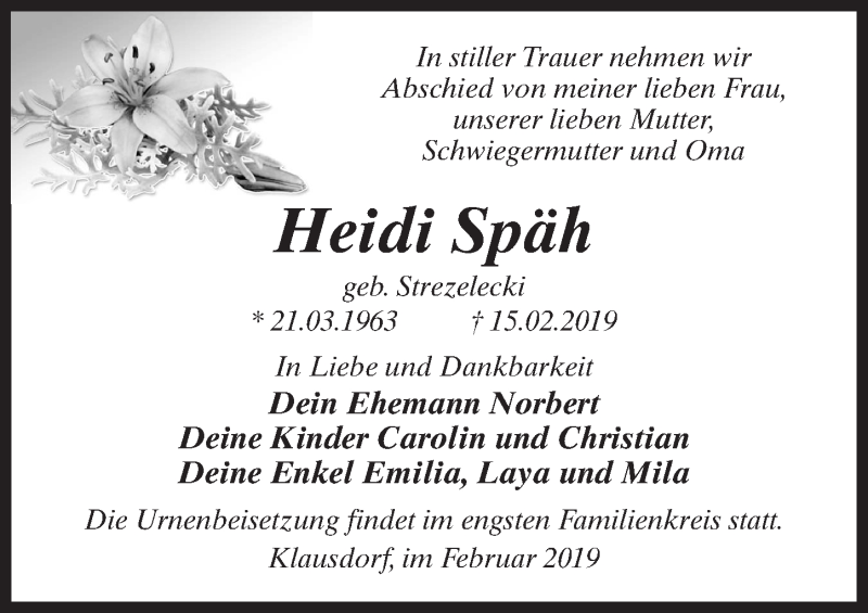 Hier finden Sie alle Traueranzeigen aus der Zeitung, die bisher für Heidi Späh erschienen sind. Weitere Traueranzeigen, die in der Zeitung erscheinen, werden hier ebenfalls aufgelistet