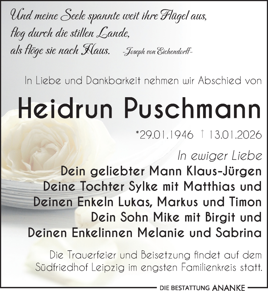 Hier finden Sie alle Traueranzeigen aus der Zeitung, die bisher für Heidrun Puschmann erschienen sind. Weitere Traueranzeigen, die in der Zeitung erscheinen, werden hier ebenfalls aufgelistet