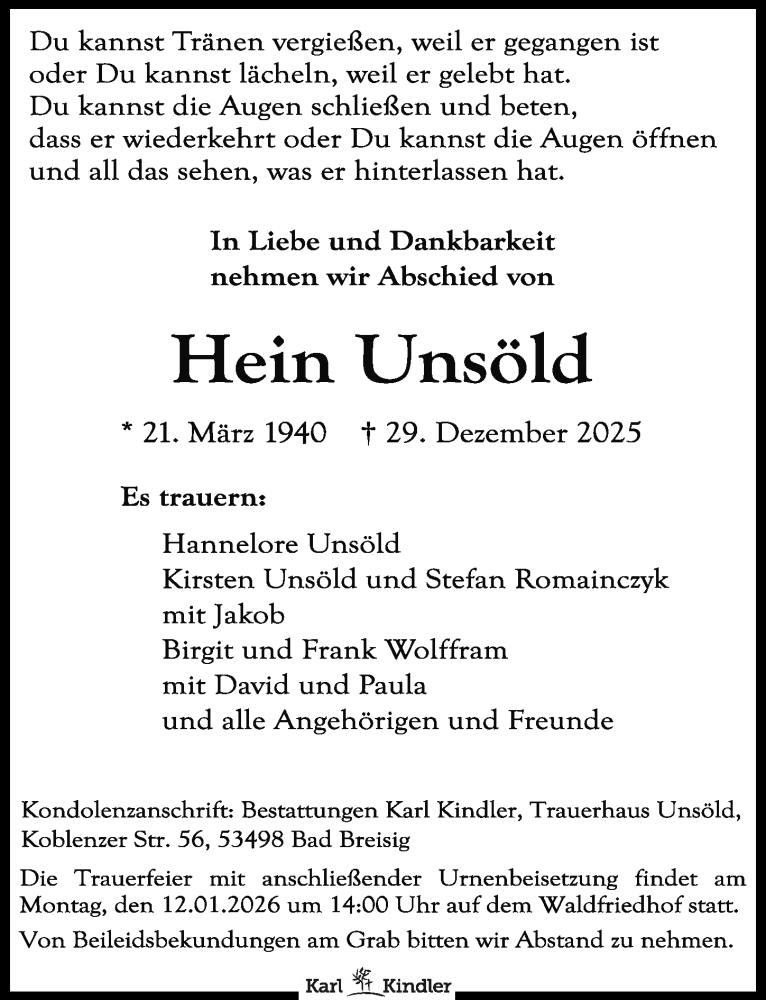 Hier finden Sie alle Traueranzeigen aus der Zeitung, die bisher für Hein Unsöld erschienen sind. Weitere Traueranzeigen, die in der Zeitung erscheinen, werden hier ebenfalls aufgelistet