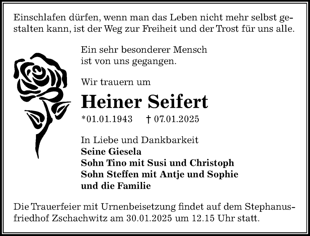 Hier finden Sie alle Traueranzeigen aus der Zeitung, die bisher für Heiner Seifert erschienen sind. Weitere Traueranzeigen, die in der Zeitung erscheinen, werden hier ebenfalls aufgelistet