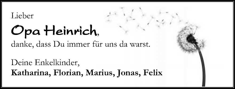 Hier finden Sie alle Traueranzeigen aus der Zeitung, die bisher für Heinrich erschienen sind. Weitere Traueranzeigen, die in der Zeitung erscheinen, werden hier ebenfalls aufgelistet