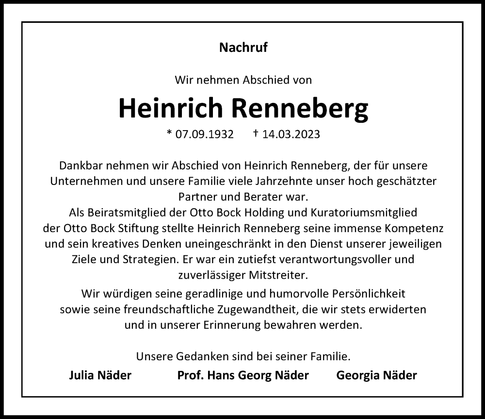 Hier finden Sie alle Traueranzeigen aus der Zeitung, die bisher für Heinrich Renneberg erschienen sind. Weitere Traueranzeigen, die in der Zeitung erscheinen, werden hier ebenfalls aufgelistet