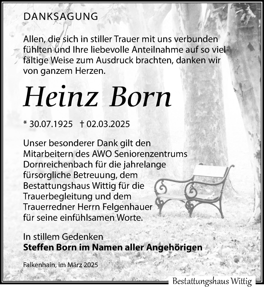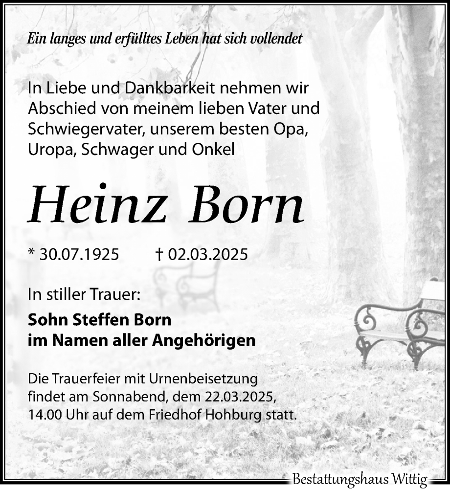 Hier finden Sie alle Traueranzeigen aus der Zeitung, die bisher für Heinz Born erschienen sind. Weitere Traueranzeigen, die in der Zeitung erscheinen, werden hier ebenfalls aufgelistet