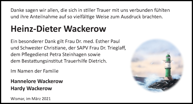 Hier finden Sie alle Traueranzeigen aus der Zeitung, die bisher für Heinz-Dieter Wackerow erschienen sind. Weitere Traueranzeigen, die in der Zeitung erscheinen, werden hier ebenfalls aufgelistet