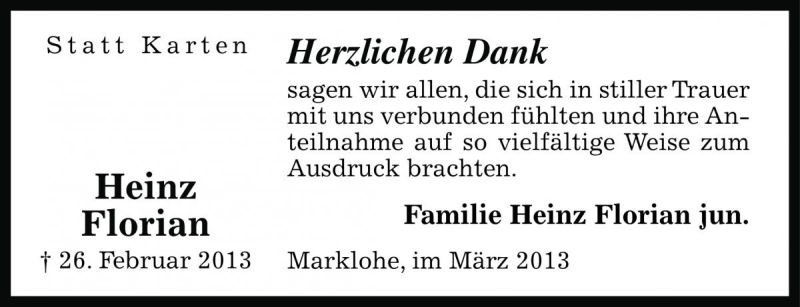 Hier finden Sie alle Traueranzeigen aus der Zeitung, die bisher für Heinz Florian erschienen sind. Weitere Traueranzeigen, die in der Zeitung erscheinen, werden hier ebenfalls aufgelistet