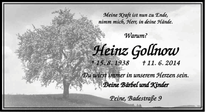 Hier finden Sie alle Traueranzeigen aus der Zeitung, die bisher für Heinz Gollnow erschienen sind. Weitere Traueranzeigen, die in der Zeitung erscheinen, werden hier ebenfalls aufgelistet
