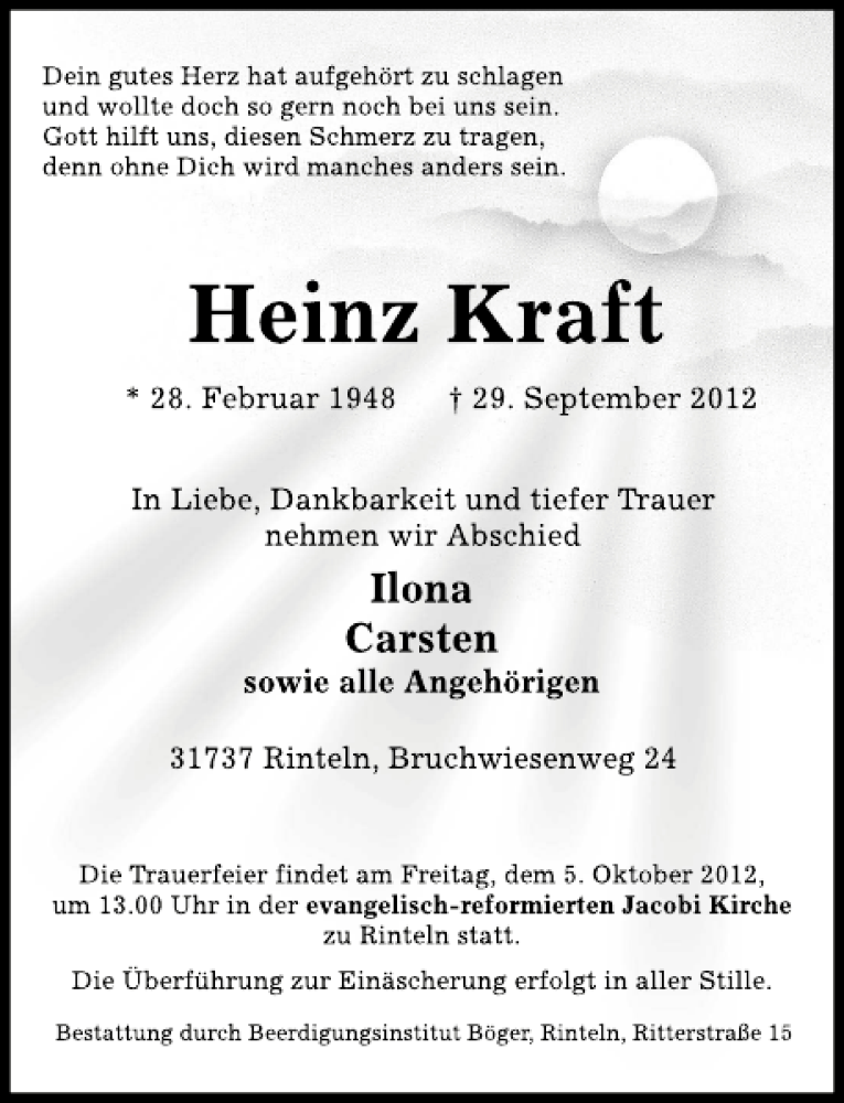 Hier finden Sie alle Traueranzeigen aus der Zeitung, die bisher für Heinz Kraft erschienen sind. Weitere Traueranzeigen, die in der Zeitung erscheinen, werden hier ebenfalls aufgelistet