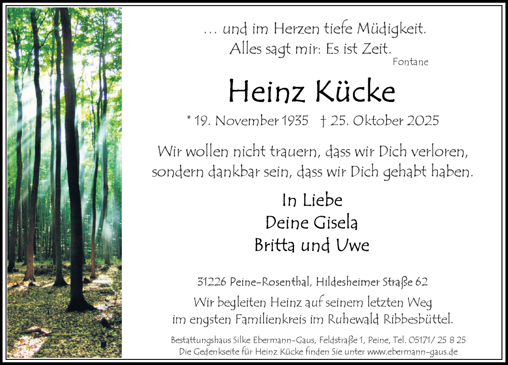 Hier finden Sie alle Traueranzeigen aus der Zeitung, die bisher für Heinz Kücke erschienen sind. Weitere Traueranzeigen, die in der Zeitung erscheinen, werden hier ebenfalls aufgelistet
