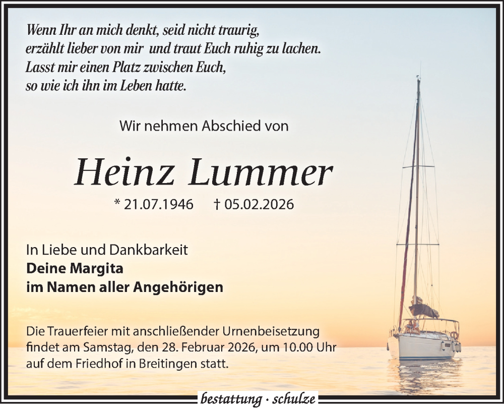 Hier finden Sie alle Traueranzeigen aus der Zeitung, die bisher für Heinz Lummer erschienen sind. Weitere Traueranzeigen, die in der Zeitung erscheinen, werden hier ebenfalls aufgelistet