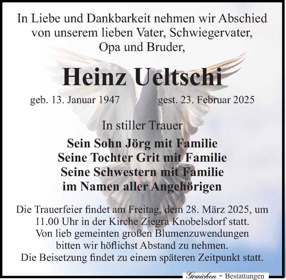 Hier finden Sie alle Traueranzeigen aus der Zeitung, die bisher für Heinz Ueltschi erschienen sind. Weitere Traueranzeigen, die in der Zeitung erscheinen, werden hier ebenfalls aufgelistet