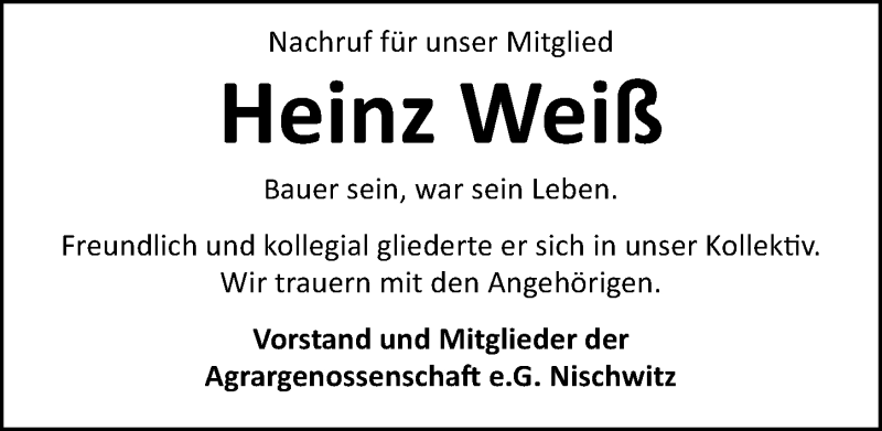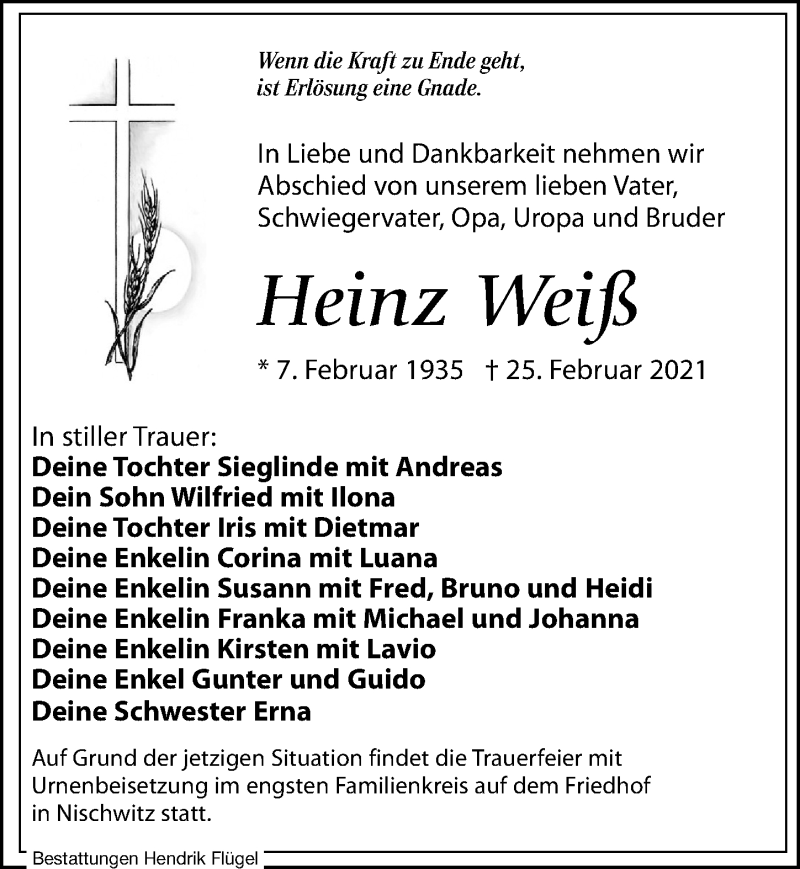 Hier finden Sie alle Traueranzeigen aus der Zeitung, die bisher für Heinz Weiß erschienen sind. Weitere Traueranzeigen, die in der Zeitung erscheinen, werden hier ebenfalls aufgelistet