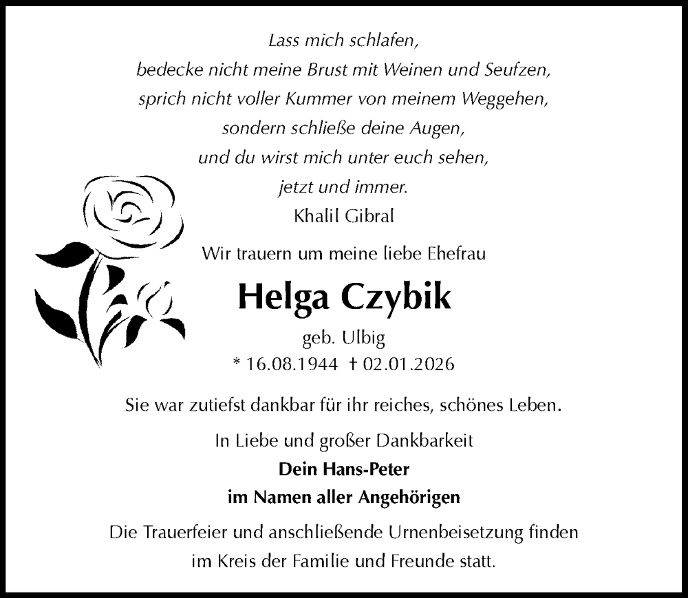 Hier finden Sie alle Traueranzeigen aus der Zeitung, die bisher für Helga Czybik erschienen sind. Weitere Traueranzeigen, die in der Zeitung erscheinen, werden hier ebenfalls aufgelistet