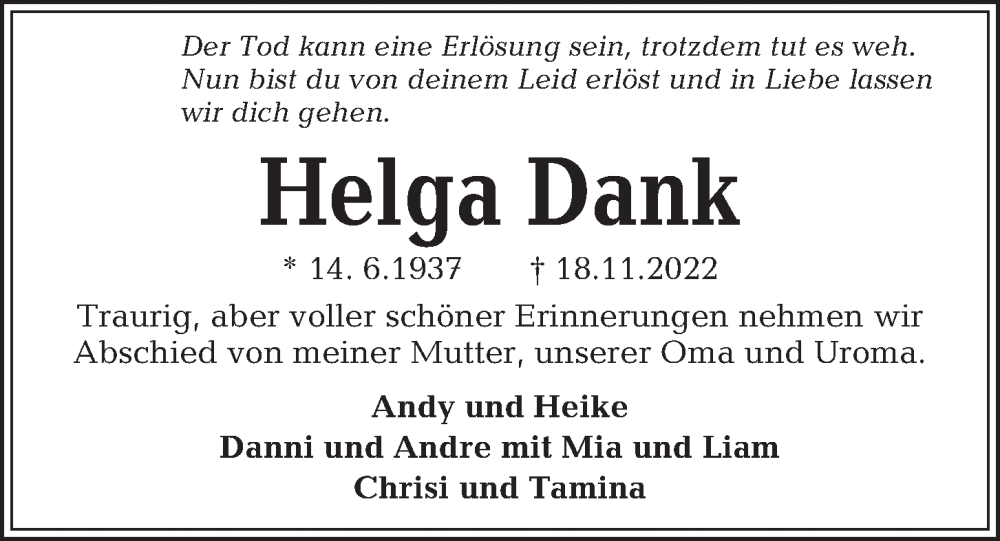 Hier finden Sie alle Traueranzeigen aus der Zeitung, die bisher für Helga Dank erschienen sind. Weitere Traueranzeigen, die in der Zeitung erscheinen, werden hier ebenfalls aufgelistet