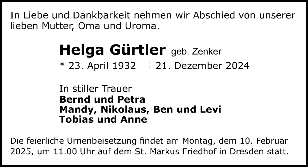 Hier finden Sie alle Traueranzeigen aus der Zeitung, die bisher für Helga Gürtler erschienen sind. Weitere Traueranzeigen, die in der Zeitung erscheinen, werden hier ebenfalls aufgelistet
