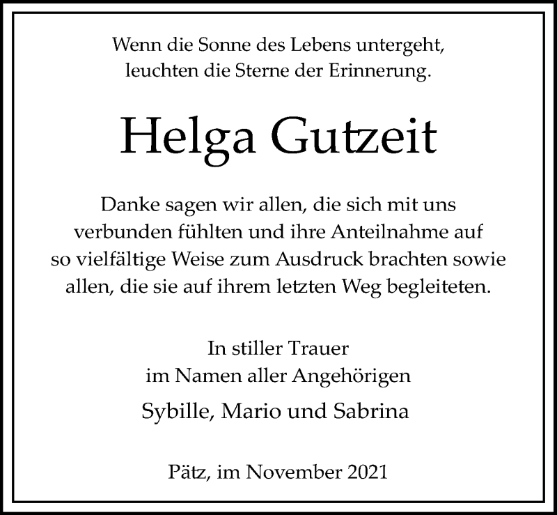 Hier finden Sie alle Traueranzeigen aus der Zeitung, die bisher für Helga Gutzeit erschienen sind. Weitere Traueranzeigen, die in der Zeitung erscheinen, werden hier ebenfalls aufgelistet