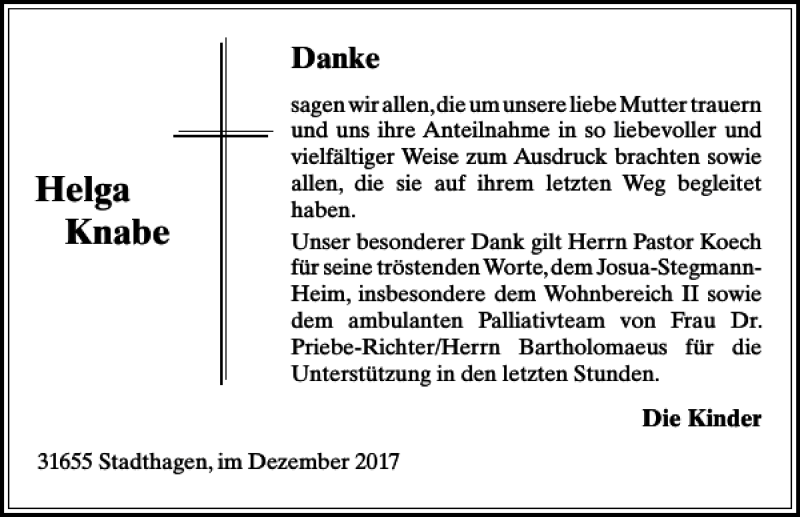 Hier finden Sie alle Traueranzeigen aus der Zeitung, die bisher für Helga Knabe erschienen sind. Weitere Traueranzeigen, die in der Zeitung erscheinen, werden hier ebenfalls aufgelistet